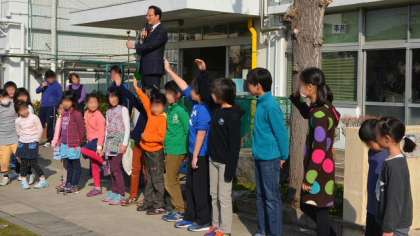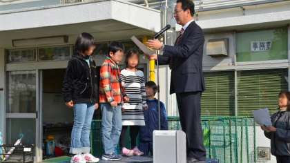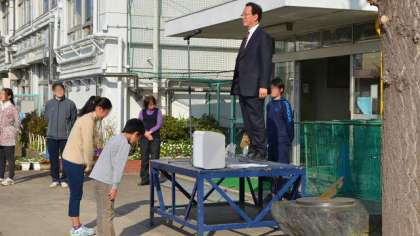 17日(月)、暖かい春の日差しを浴びて、校庭の芝生で朝会を行いました。昨日の「子どもぶんか村」で発表した子どもたちに、列の前に出てきてもらって、「くらぶ」ごとに紹介しました。その後、書写の優秀作品として都展に出品された3人の子の表彰を行いました。昨年の今頃は桜の花が咲き始めていましたが、今年はいつ頃になるのでしょうか。春の気配の中で行った朝会でした。