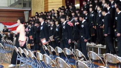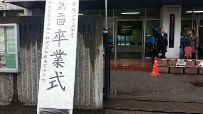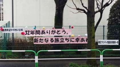 2時間余の卒業式。すばらしい卒業式でした。在校生のすてきな歌に送られて退場する生徒が、希望に満ちあふれて堂々と歩んでいった姿が印象的でした。卒業式が終わって正門を出たとき、道路をはさんだ新聞社の印刷所のフェンスにメッセージが・・・。この校舎は今年度をもって、希望丘中学校、そして船橋希望中学校としての役目を終えます。