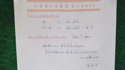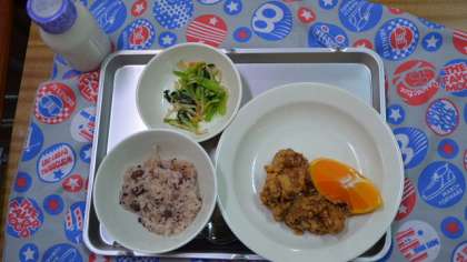 20日(木)は25年度最後の給食でした。メニューは赤飯、鶏から揚げ、おひたし、デザートのアイスクリーム、牛乳です。卒業祝いの「赤飯給食」です。