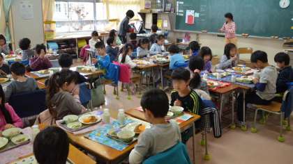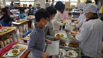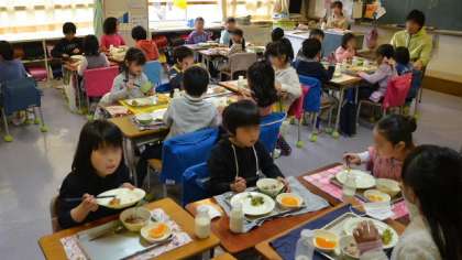 衣はパリパリ、中のお肉はジューシーに揚がった鶏の唐揚げを、おいしそうにほおばる子どもたちです。