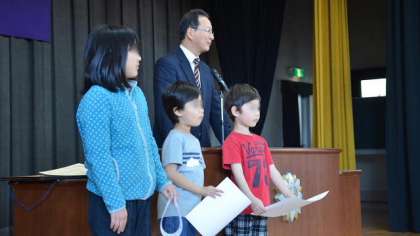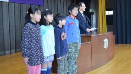修了式の後、今日は3つの表彰をしました。まず最初に、ペットボトルキャップや牛乳パックの回収によく頑張ったクラスを表彰しました。今回は5年生と1年1組、2組がベスト3に入り、代表児童に表彰状を渡しました。これは、家庭の協力がなければ達成できないことです。続いて「せたがや学校エコライフ 活動先進的取り組み賞」を本校が受賞したことを伝え、今回その評価の対象になった「児童会エコ委員会」に表彰状を授与しました。委員長が委員会のメンバーを代表して受け取りました。最後の表彰は、土曜日に1〜3年生が参加して行っている「新寺子屋」にお手伝い役で参加した4年生児童4名を表彰しました。新寺子屋を卒業した子どもたちが、こうやって活躍していること、うれしく思います。