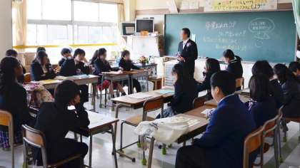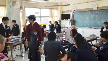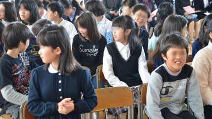 登校してきた6年生は、今日でさようならをする教室でひとときをすごします。黒板には担任からのメッセージが。4・5年生は体育館でスタンバイです。