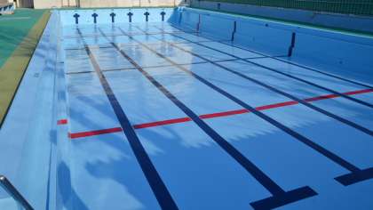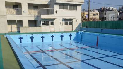 プール内壁の塗装工事と排水溝の修繕が終了しました。長期間工事車両駐車等で、校庭利用あたってご不便をおかけしました。来シーズンはきれいになったプールで、気持ちよく水泳ができます。