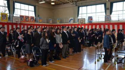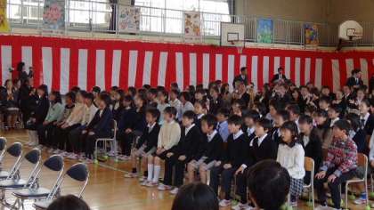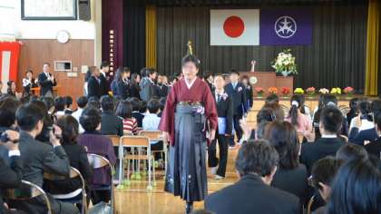 最後に会場の皆様にもご起立いただき、全員でまど・みちおさん作詞の校歌を声高らかに歌い、卒業式を終了しました。感動的な卒業式を成し遂げた卒業生が、4・5年生の歌に合わせて、誇らしげに退場しました。4・5年生も、卒業生のために精一杯歌っている姿が印象的でした。本当にすてきな子どもたちです。
