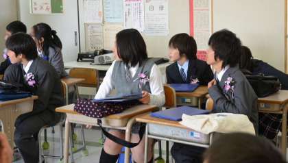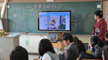 25日、卒業式後教室に戻ってほっと一息。2組では、担任が子どもたちの小さい頃のようすをスライドにまとめたものを見せて最後の授業。楽しそうでした。
