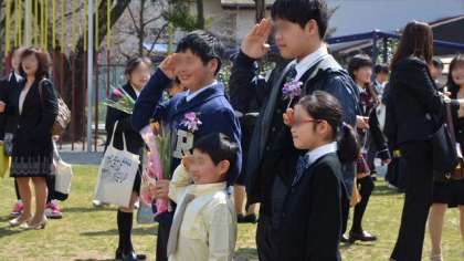 見送りが終わった後も、名残惜しい子どもたちは校庭で記念撮影。満面の笑みがこぼれます。