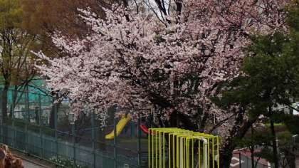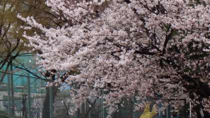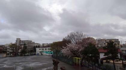 校庭の南側の本村公園の桜も見頃になっています。ところがどんよりした雲と横殴りの雨、そして強風で激しく枝があおられ、花が散ってしまいそうです。