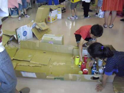 ボーリングは、曲がったコースをつくり、ピンを倒すのが難しくなるように工夫されていました。材料がたくさん必要で大変だったと思いますが、しっかりと準備されていました。(77)