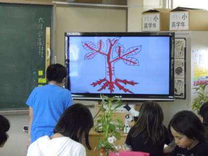 今日の5時間目は、6年1組で理科の研究授業が行われました。「植物の養分の通り道」の学習で、植物に赤い水を吸わせて、植物の体内の水などの行方を観察する学習でした。