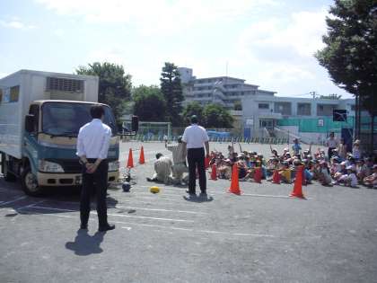 実際にトラックに来ていただき、実演を交えて、車が右折をする際に、運転手から歩行者が見えにくいということを教えていただきました。