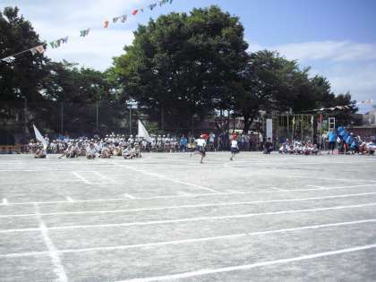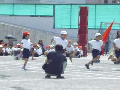 午前中は1、2年生が50メートル、3年が80メートル、5年が100メートルを走りました。