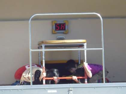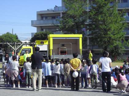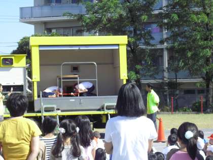 全校が起震車の前に集合し、5年生代表と教員の代表が起震車に乗って、震度7程度の地震の揺れを体験しました。