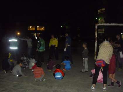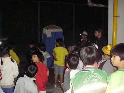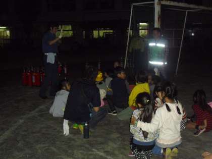 避難所宿泊体験訓練午後5時30分からは子どもの訓練が行われました。消火器訓練、バケツリレーによる消火の訓練、マンホールトイレの見学などを行いました。