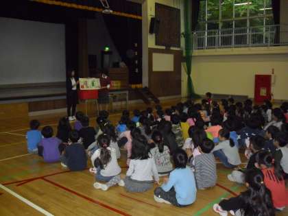 今日の朝の時間は、読書週間の取組として、一斉読み聞かせ会を行いました。1、2年生は体育館で、3年から6年生は教室で行いました。