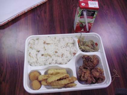 今日の給食の時間は、希望っ子班ごとに、校庭の芝生の上で食べました。今日の給食は、給食室のご厚意により、お弁当にしていただきました。子どもたちは大変おいしそうに、そして嬉しそうに食べていました。(179)