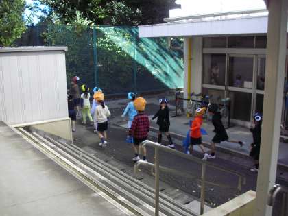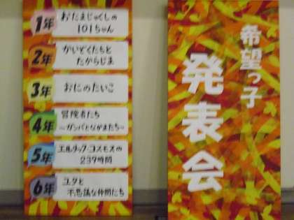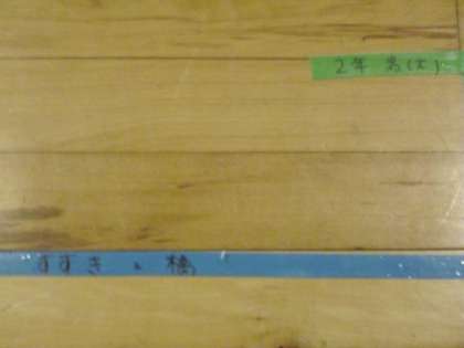 立て看板も準備万端です。そして舞台では、大道具を早く、確実に置けるよう、テープでポイントが打ってあります。(191)