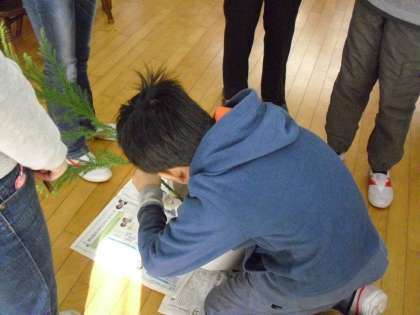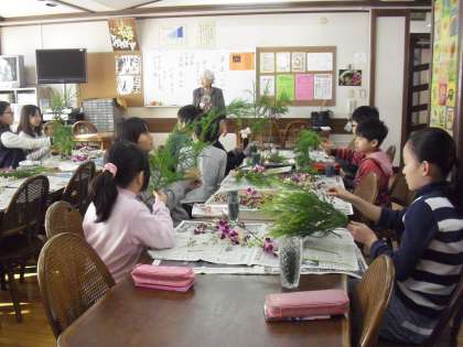 ランチルームでは、華道が行われていました。子どもたちは、準備された花や木をどのように生けようか、思いを巡らせて取組んでいました。(219)