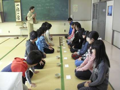 生活科室では、畳をしき、茶道を体験していました。前には、「一期一会」と掛け軸が飾られ、引き締まった雰囲気が感じられました。