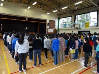 東日本大震災からもうすぐ4年。「3・11を忘れない」に寄せられたメッセージが紹介され、毎月の避難訓練を真剣に取り組むこと、災害の時には協力し合うことの大切さについてお話がありました。