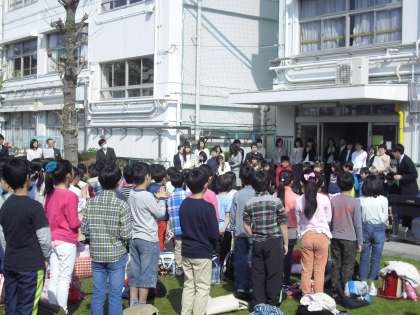 この1年間校歌にあるように「みがこう、きたえよう」を合い言葉に、一生懸命勉強して、友達と仲良くし、先生の話を聞いて、この1年でぴかぴかに自分をみがきましょうという話をしました。さいさきよいスタートをきりました。(1)