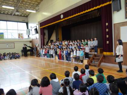 1年生は呼びかけと歌「ドキドキドン!1年生」を、大きな声で堂々と発表。たくさんの拍手をもらってうれしそうでした。