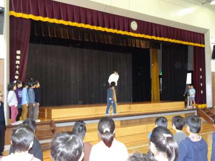 2年生の児童による、あいさつの良いお手本、良くないお手本をみながら、どんなあいさつをしたらよいか、児童一人一人が考えていました。