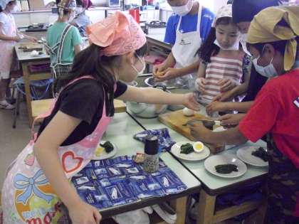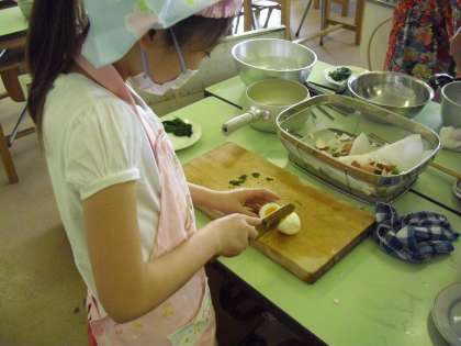 今日の1、2校時、家庭科室では、5年生が調理実習をしていました。ゆで卵と野菜をゆでた料理をつくっていました。ゆで卵を切るとき、少し心配した場面もありましたが、とてもたのしそうに学習に取り組んでいました。おうちでもつくってみるといいですね。(63)