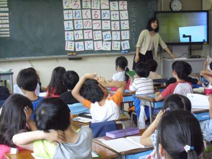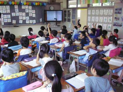 今日の2校時、1年2組では、「ひらがな」の学習を行いました。これまで学習してきたひらがなを使って、言葉をつくる学習でした。つくったことばは、丁寧にノートに写しました。実物投影機をつかって指導していたので、お手本通りにノートにかくことができました。言葉を言いながら「手拍子」をしながら、言葉のリズムを感じていました。(64)