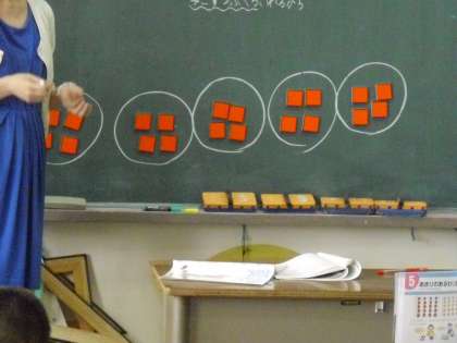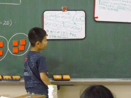 20÷4と23÷4の計算を行い、特に23÷4の計算の求め方について、おはじきを使て考えたり、絵や言葉にかいて考えたりしていました。