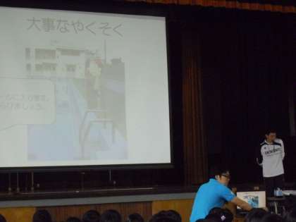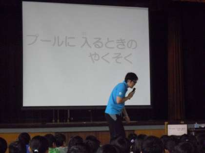 今日の全校朝会では、来週から始まる水泳指導の際の約束について、パワーポイントを使いながら担当教諭から話がありました。