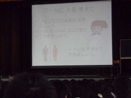体調を整えたり、爪や髪などを整えたりするなど、画面をみながら子どもたちは確認していました。また、プールの中に入る際の約束についても、実際に笛を吹きながら、画面の絵が動き、分かりやすく説明されました。