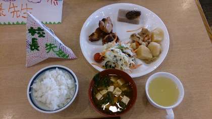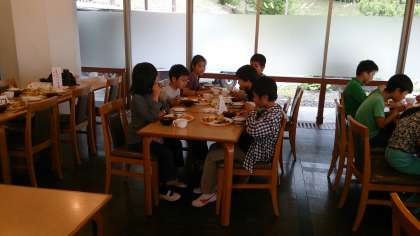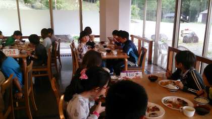 夕食です。リンゴジュースがおいしく、おかわりをする子どもが多いです。