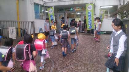 小雨まじりの中、船橋希望中の生徒と一緒に、気持ちのよいあいさつを全校児童に呼びかけました。