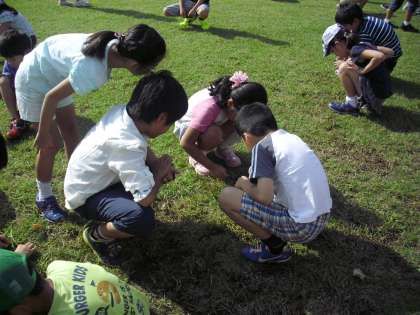 今日の全校朝会では、全校児童で雑草とりを行いました。毎週木曜日に行っているエコ委員会の児童による芝刈りではとることは大変でしたが、一人30本を目標に行ったところ、あっという間にきれいになりました。「希望丘小学校の芝」全児童で守っていきたいと思います。(211)