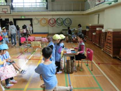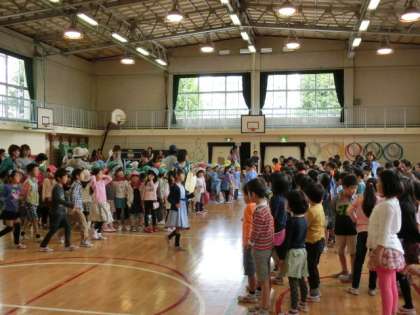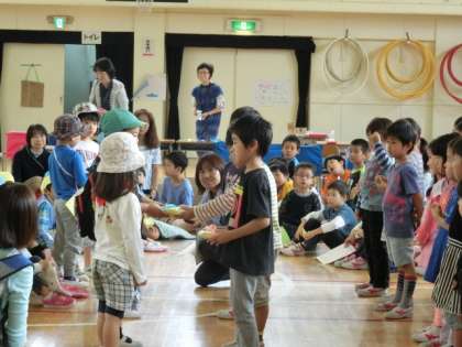 今日の2校時から体育館では、幼稚園や保育園の年長さんの幼児を招いて、「わくわくフェスティバル」を行いました。1年生は、歓迎のよびかけと歌、そして自分たちで育てたあさがおの種をプレゼントしました。2年生は、自分たちで遊びを考えて、年長さんの幼児が遊べるよう準備をしました。6月に行った希望っ子フェスティバルの経験が生きており、楽しい遊びを考えることができました。(236)