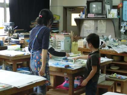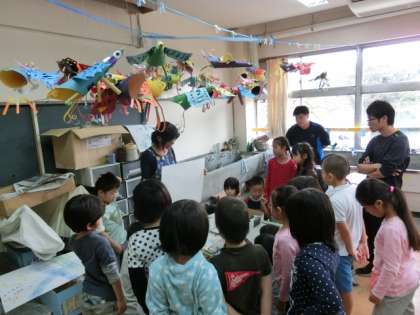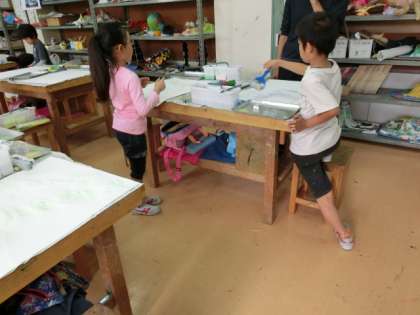 今日の3、4校時2年1組は図工の授業でした。展覧会に向け作品づくりも佳境に入ってきています。今日は、ローラーやペットボトルのふたなどをつかってきれいな水の中を描くという教材に取り組んでいました。きれいな色遣いで、完成がとても楽しみになりました。(242)
