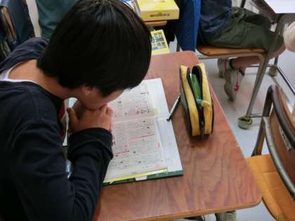 4校時6年1組では、国語の授業が行われていました。「漢字のなりたち」について辞書で調べ、その4の成り立ちについて学ぶ学習でした。何気なくつかっている漢字でも作られてきた過程で様々な意味が込められているということを学んでいました。自分の氏名の漢字が4の成り立ちのうちどれに当たるかも調べていました。(243)