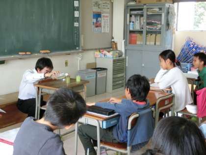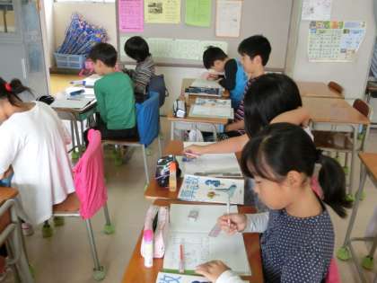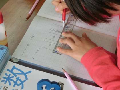 今日の2校時、3年生は算数の学習でした。3年2組の教室では、小数の学習を行っていました。「2.4は0.1がいくつ集まってできているか。」について、数直線などをつかって理解する学習でした。ノートに図をきれいにかき、丁寧に学習が進められ、子どもたちはしっかりと理解していました。(245)