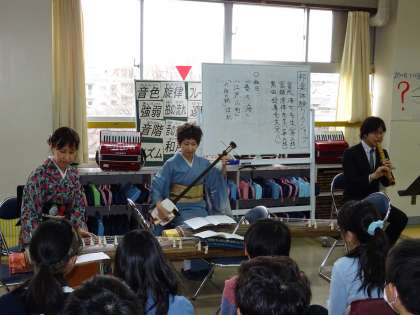 先生方の生の演奏を鑑賞したり、実際に楽器の演奏を体験したりしながら、日本の音楽独特の美しさやおもしろさに、児童は目を輝かせていました。
