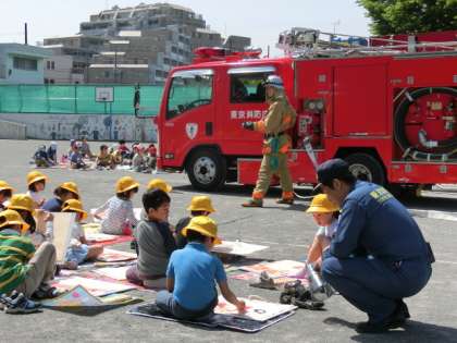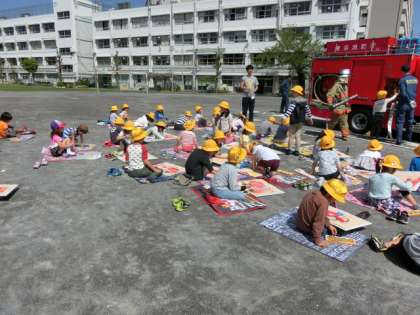 今日の1、2校時は、1年生と2年生が消防写生会を行いました。校庭に来てくれた消防車の絵と消防士さんの絵を一生懸命に描いていました。晴天の中とて楽しそうでした。