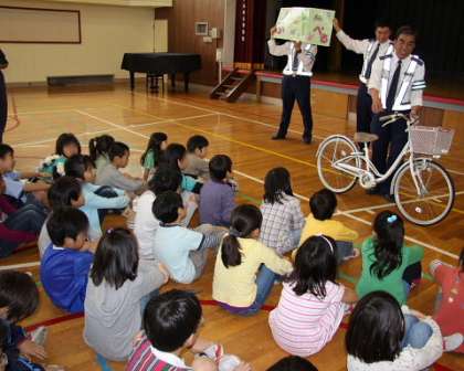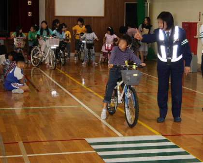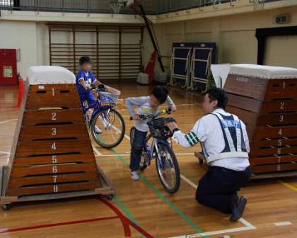 1年生のあとは、3年生の交通安全教室です。子どもたちが家からもってきた自転車を使って、自転車の乗り方教室です。最初にお話を聞いて、その後自分の体にあった自転車を選んで実習しました。普段乗り慣れている自転車も、あらたまった場で警察の方の指導を受けて・・・ということで少し緊張気味でしたが、どの子も一生懸命取り組みました。