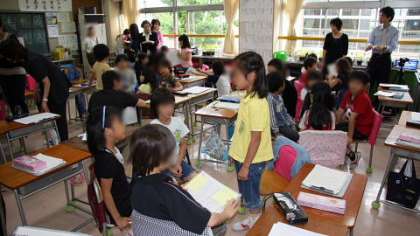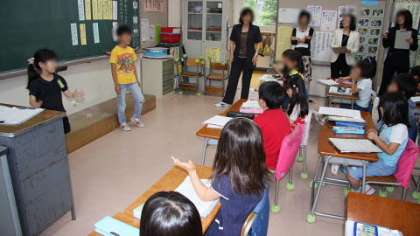 5月26日、2年生の研究授業を行いました。今年度、本校の構内研究は、昨年度に引き続いて「お互いを認め合って話し合うことのできる児童の育成」として全教員が年間で必ず1回は研究授業をすることにして取り組んでいます。(詳しくはホームページ「希望丘の研究」をご覧ください)。今日は研究授業の1回目、2年生の国語の授業です。明日、生活科の授業で2年生が1年生に学校案内をすることになっているのですが、その際に1年生にどう説明するかを学習しました。どの子も一生懸命話し、聞くという授業に向かう態度、また、発表した子に自然に拍手がわきあがり、互いに相手のよさを認め合う姿勢に好感がもてました。授業の後、講師の先生に授業についての講評をしていただき、研究を深めました。