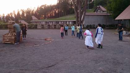 キャンプファイアを成功させようと係の児童が練習しています。