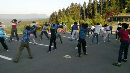 関西弁のラジオ体操をして朝会を行いました。みんな元気です。