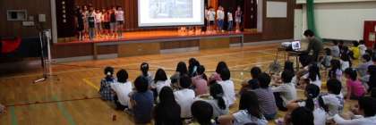 5圧28日朝、体育館で3年生の発表集会をしました。3年生は社会科で地域のことについて学習しているので、今日は調べたことを発表しました。舞台中央のスクリーンに子どもたちが写した写真や、担任がつくった資料を大写しにし、3年生全員が舞台両側でその説明を大きなわかりやすい声でしました。地域のことがよくわかるすばらしい発表でした。1年から6年生まで、しっかりと聞いていたのも立派です。発表の内容がよかったからですね。保護者の方も訪れ、参観してくださいました。