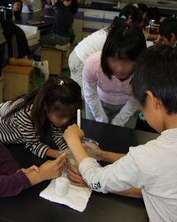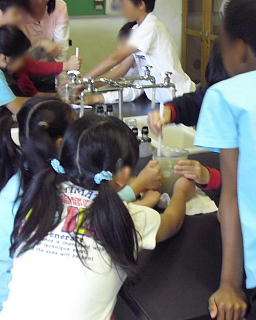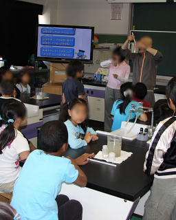 5月28日、4年生が「水道キャラバン」の出前授業を理科室で行いました。東京都水道局が関わっている事業で、水を浄化して水道水にするまでの過程を実験でわかりやすく説明してくれます。水道についての説明の後、いよいよ実験です。大きなビーカーに水をいれ、「濁りのもと」をいれて浄化する前の水に見立てます。