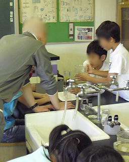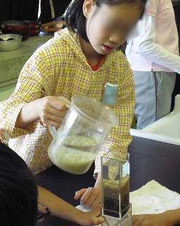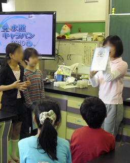 濁り水に凝集剤をいれて不純物を沈殿させ、濾過剤で濾して水道水のできあがりです。わかりやすく楽しい実験に、子どもたちも大喜び。目を輝かせて学ぶ姿が印象的でした。最後に記念品までいただき大感激でした。4年生は記念品を持ち帰ります。