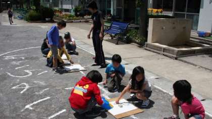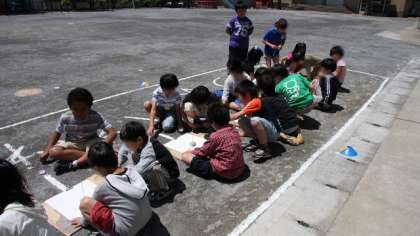 5月28日、今日は晴れの予報だったので、午前中から太陽の位置、高度を観測する理科の学習をしました。校庭に南北の位置を決めた観測用紙をおいて、中心に支柱を立てて影の方向や長さを記録します。