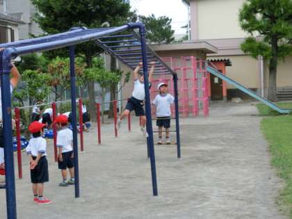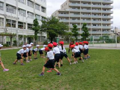 今日の2校時1年1組は、校庭で体育の授業を行っていました。固定施設で遊んだり、鬼ごっこやリレー遊びをしたりして、運動に取り組んでいました。リレー遊びの際に、自分の順番が来るまでピョンピョンはねながら自分の順番を待っているのがとてもかわいらしく、1年生らしいなと思いました。(