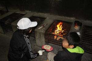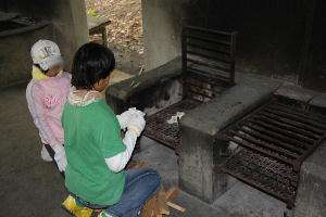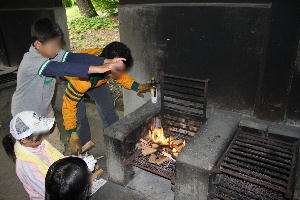 かまど係が奮闘していますが、なかなか思うようには火がつきません。最後は秘密兵器、ガスバーナーの出番です。火の調整もなかなか大変です